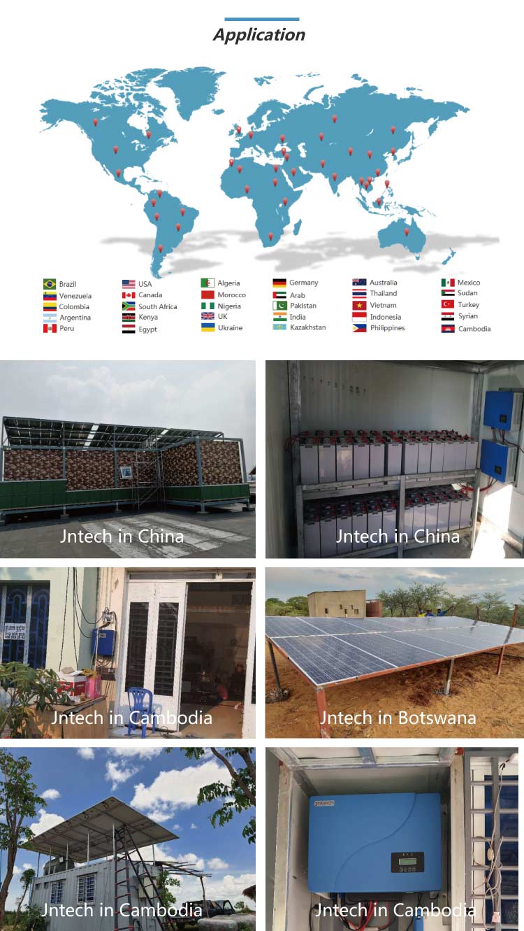 O sistema solar off-grid é composto por um módulo fotovoltaico, um inversor solar off-grid, um controlador de carga MPPT e um conjunto de baterias. O inversor solar off-grid é o dispositivo central do sistema de energia fotovoltaica e converte a energia CC produzida pelos painéis solares em CA para fornecer energia elétrica para as aplicações. O controlador de carga MPPT carrega a eletricidade solar para as baterias. Quando a energia solar não é suficiente para as cargas, ou à noite, o conjunto de baterias é descarregado para repor energia para as cargas.